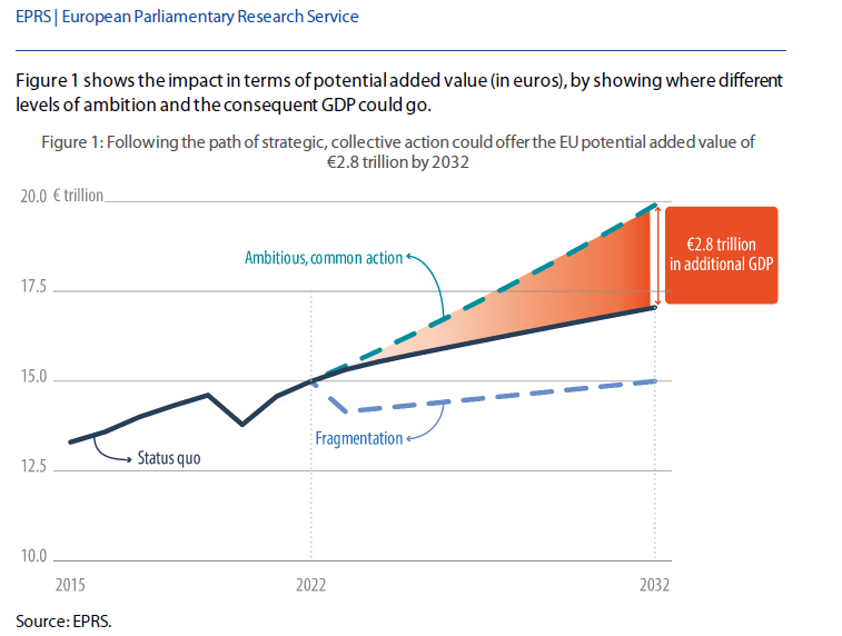 E a quanto pare dovremo ancora attendere a lungo, visto che l’argomento migliore che il Parlamento Europeo riesce a trovare per convincere gli indecisi – ossia i governi europei più che i cittadini – è che se la nostra struttura istituzionale fosse più robusta – se “facessimo l’Europa” sul serio – saremmo in grado di generare 2,8 trilioni di pil in più nell’orizzonte di scenario, che poi è il 2032.
