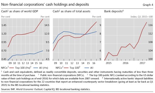Notate che la linea rossa riguarda le prime 100 aziende globali: sono loro le vere vincitrici della globalizzazione. “Come risultato – scrive la Bis – le aziende sono diventate importanti prestatrici per un certo numero di settori importanti”. Una volta si diceva che le aziende agissero come prenditori dai mercati finanziari, accendendo prestiti. Ma la globalizzazione, che le ha riempite letteralmente di soldi, ha cambiato tutto ciò. “Ad esempio – scrivono – forniscono credito agli stati e alle altre aziende attraverso l’acquisto di bond”. E non solo “le NFCs (non financial corporation) sono anche importanti fornitrici di fondi per le banche. Al punto che si è osservato un notevole aumento di depositi in dollari fuori dagli Usa che ha addirittura compensato la fuga dal mercato degli eurodollari osservata nel 2016”. Questa enorme riserva di liquidità sta mantenendo i mercati finanziari provvisti e quindi sta contribuendo al mantenimento delle politica accomodante delle banche centrali.